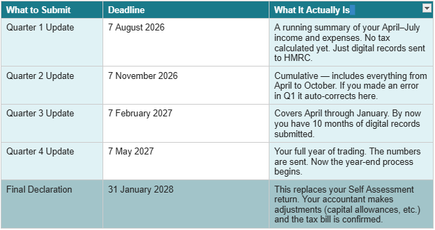 Once you're signed up, here's what your new year looks like. Instead of one annual tax return in January, you now have four quarterly updates plus a final declaration at the end. Think of it like submitting a brief progress report to HMRC four times a year, then wrapping everything up neatly in January.